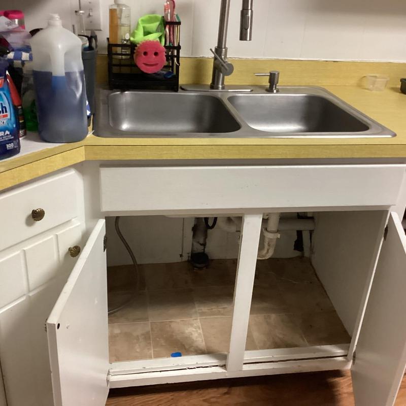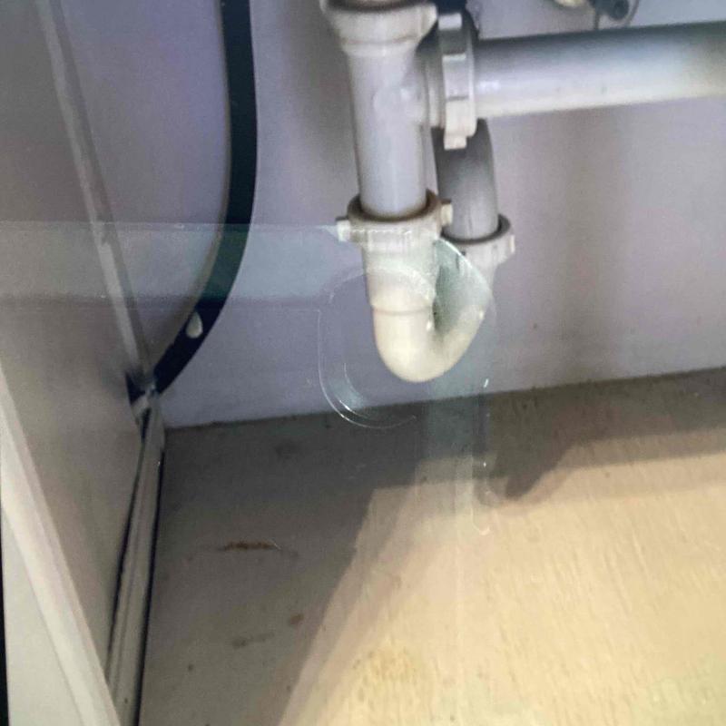 A plumber in Chattanooga, Tennessee inspected a leak under a sink. The technician found a damaged dishwasher drain and confirmed it was dry rotted. They capped the washing machine drain line and tested both sink basins for leaks to ensure proper drainage.