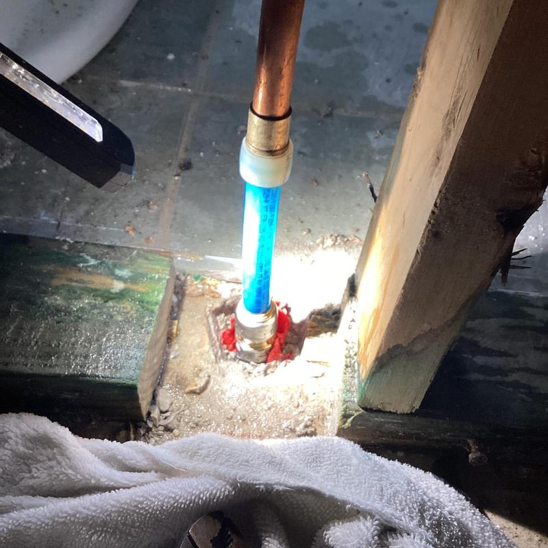 A technician in Cleveland, Tennessee repaired a water leak beneath a concrete slab. The team removed part of the concrete, installed a new PEX fitting, and restored water service. The system was tested and showed no further leaks.