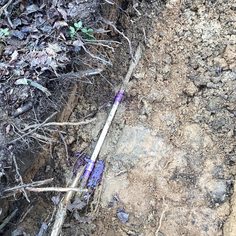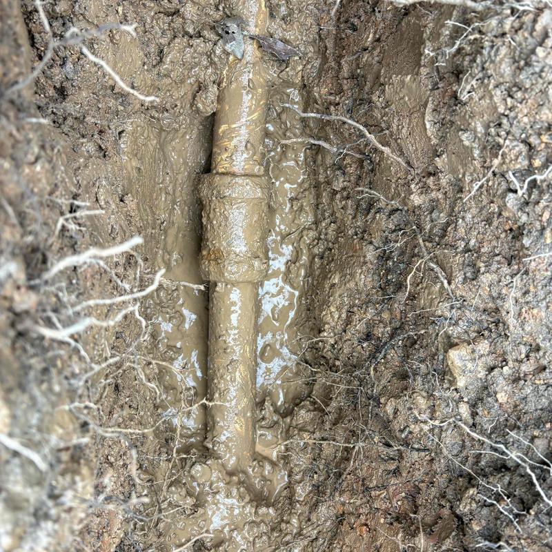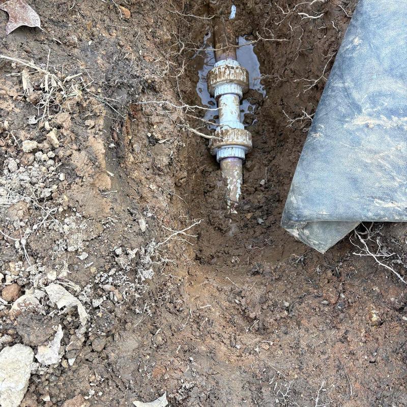A plumber in Dayton, Tennessee used a backhoe to access a damaged ¾-inch PVC pipe at a broken fitting. They cut out the damaged section, installed a new coupling and pipe, and restored water service without any leaks.