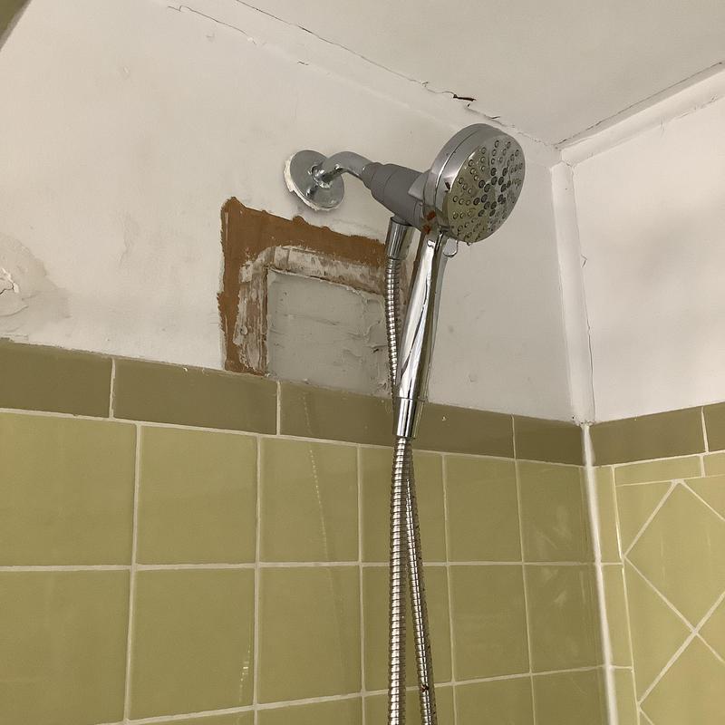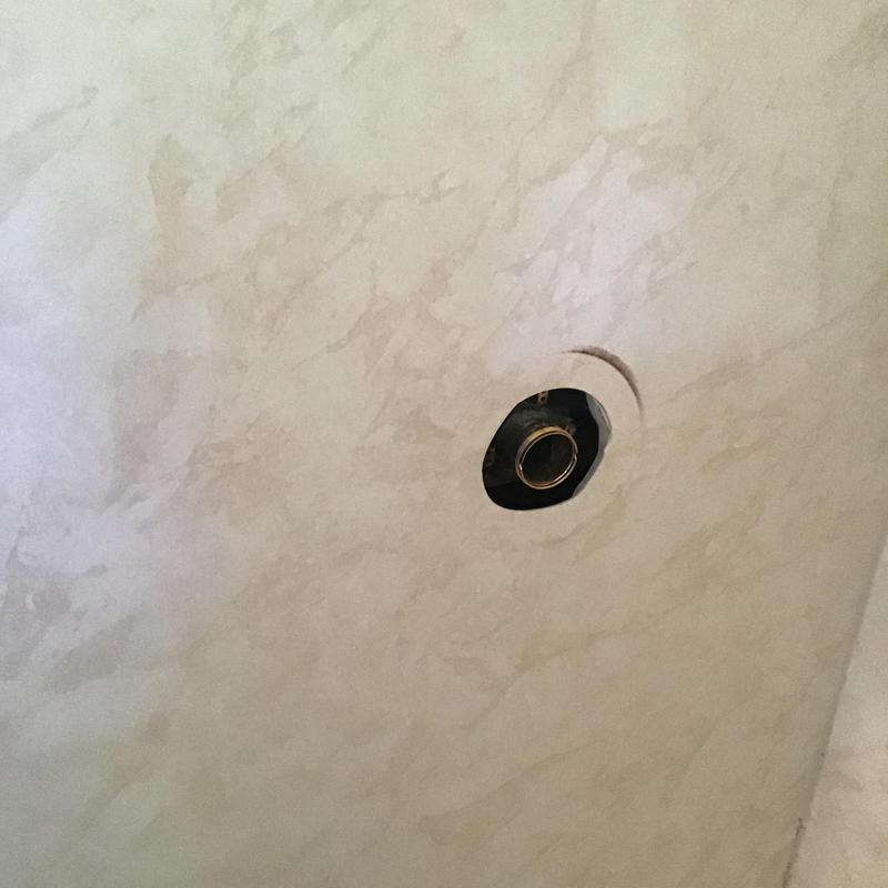 A plumber in Fresno, California removed damaged Sheetrock to access a leaking tub spout. They identified a water leak behind the shower wall affecting the ceiling above the kitchen. The contractor replaced the faulty spout and sealed its base with silicone to stop further water intrusion.