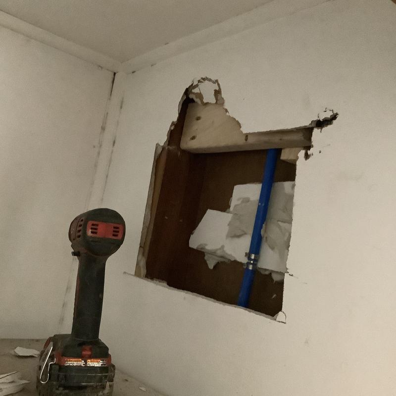 A plumber replaced a frostproof hose bib and accessed the waterlines by cutting a wall inside a closet. The installation was completed with no leaks. This plumbing service was performed in Charlotte, North Carolina.