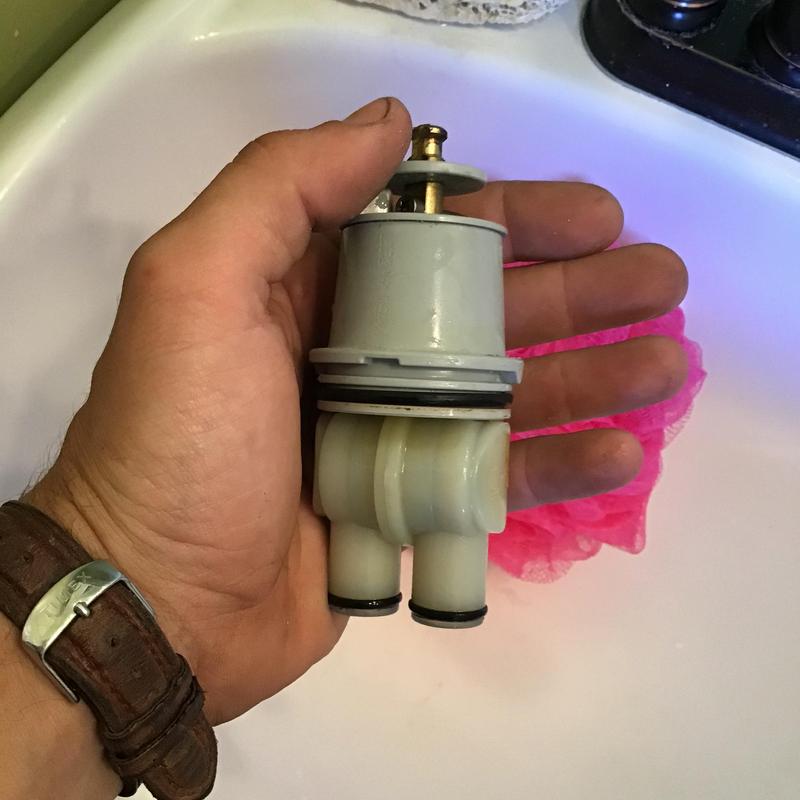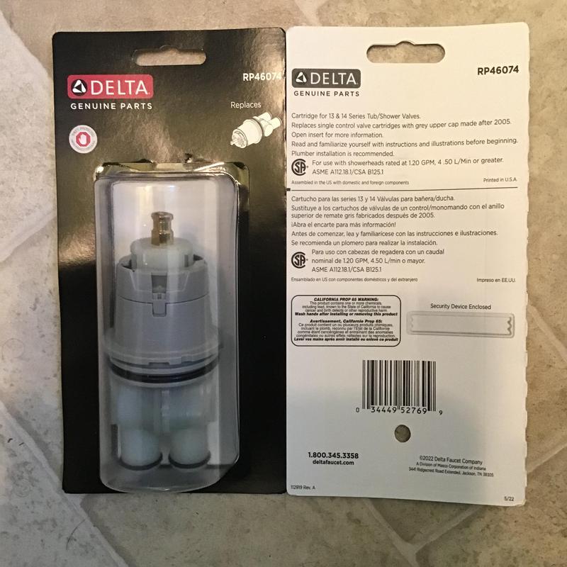 A plumber replaced a worn Delta single-handle shower cartridge clogged with rust from the water lines. The new cartridge restored proper water flow. The water system was tested and showed no leaks. This shower repair took place in Los Angeles, California.